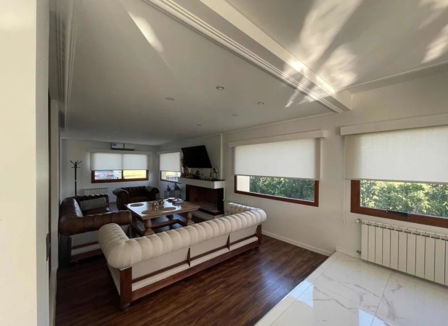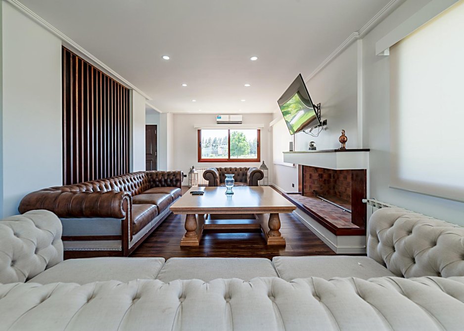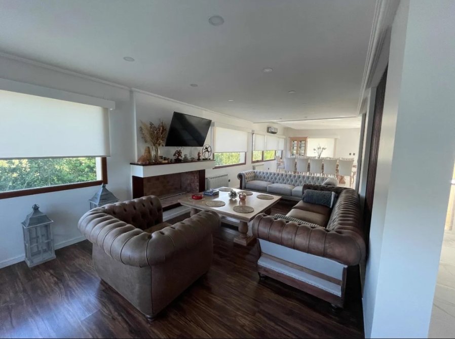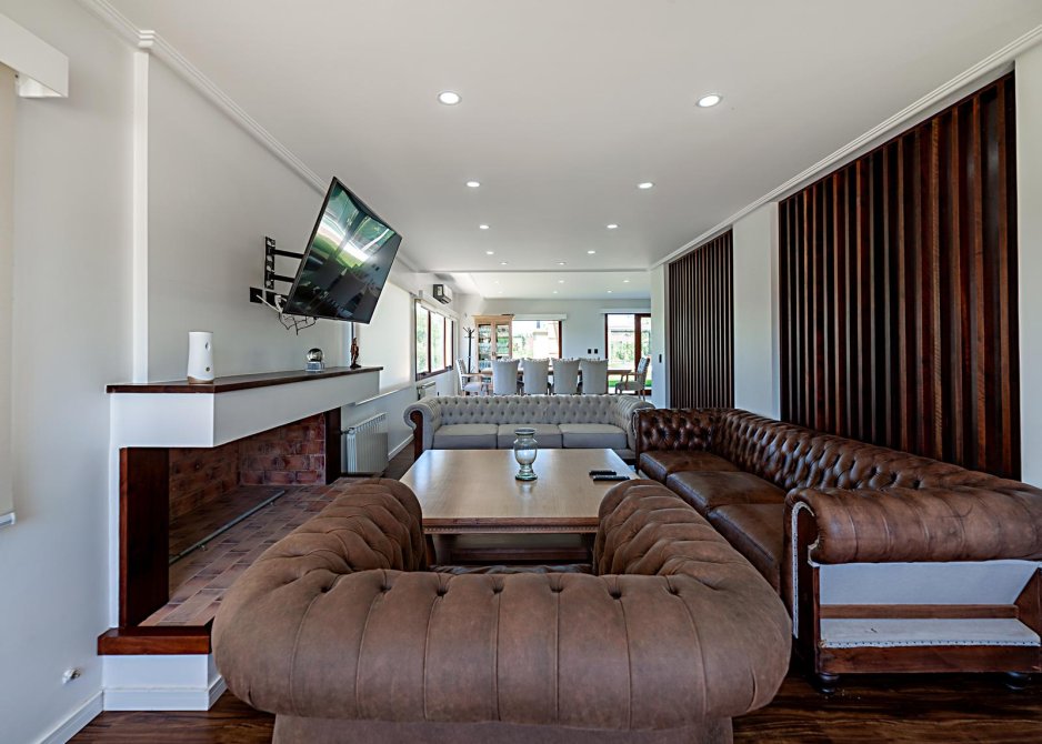 Amplio y luminoso Living con hogar a leña. Pisos de Madera.