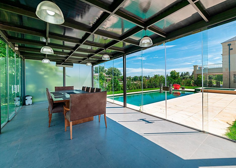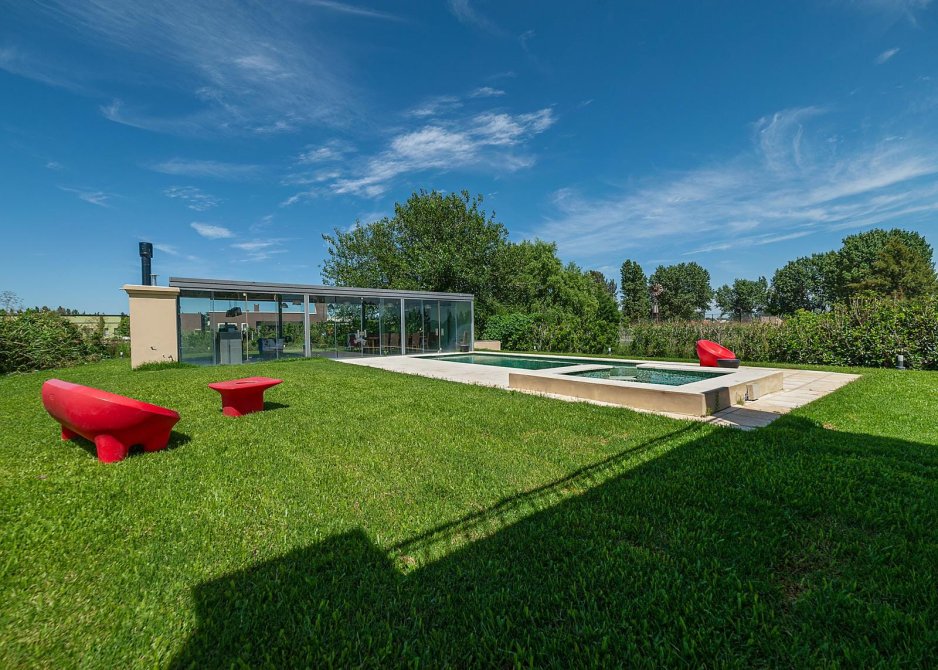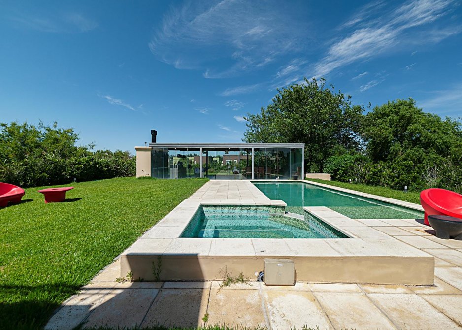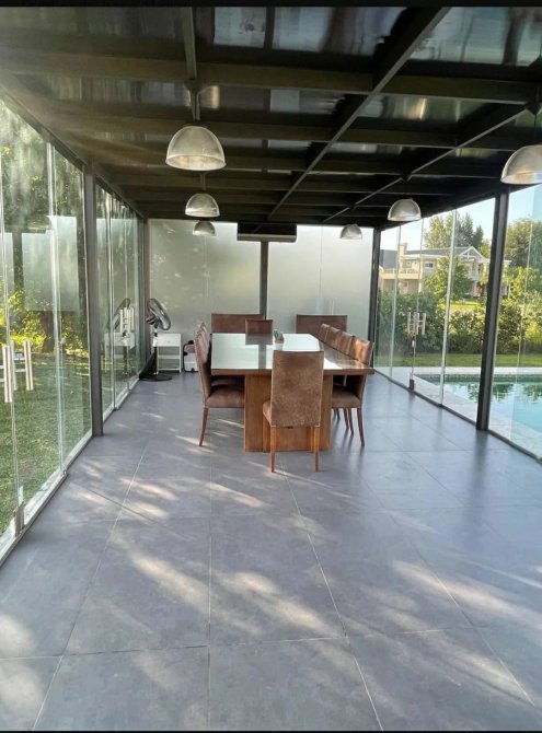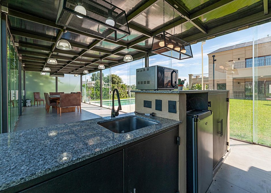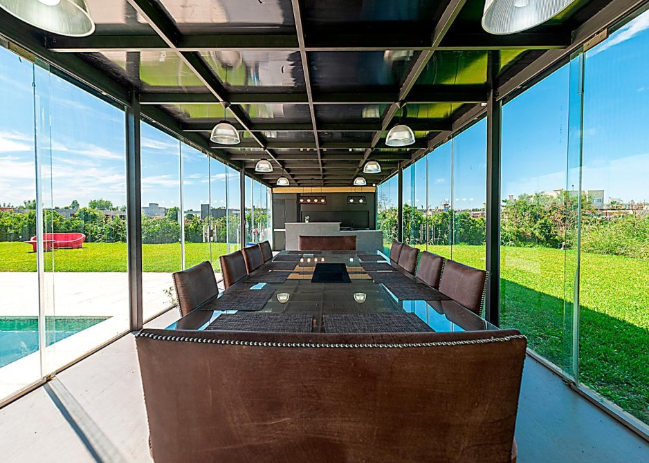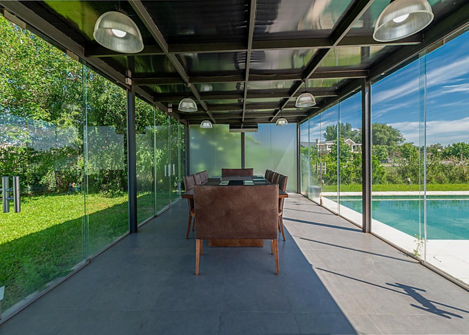 Quincho independiente al fondo de parque, totalmente en vidrio con entradas rebatibles.