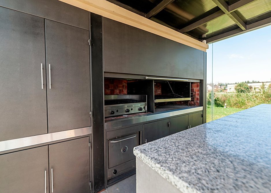 Parilla a gas, a leña, horno pizzero leñero. Barra y bacha de lavado sobre mesada de