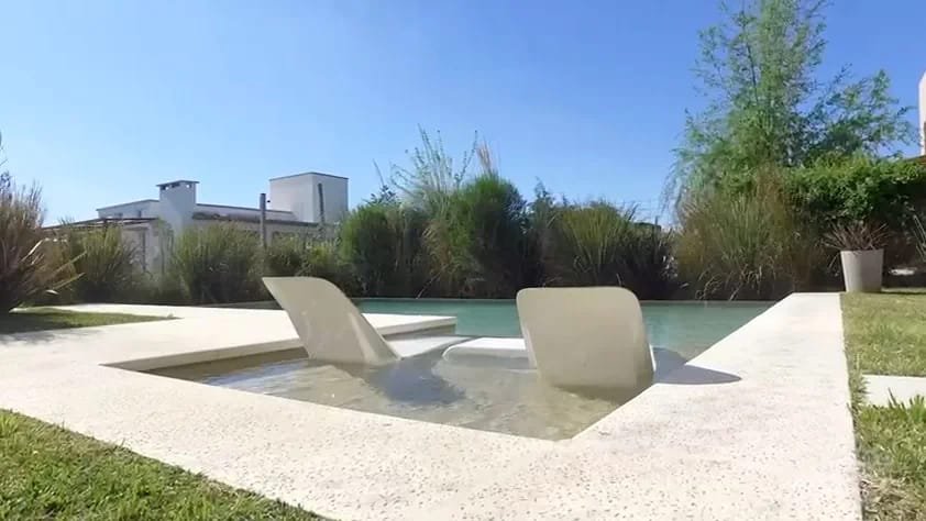 * Piscina: Una piscina de 8 x 4 metros con borde infinito y playa húmeda de 2 x 2