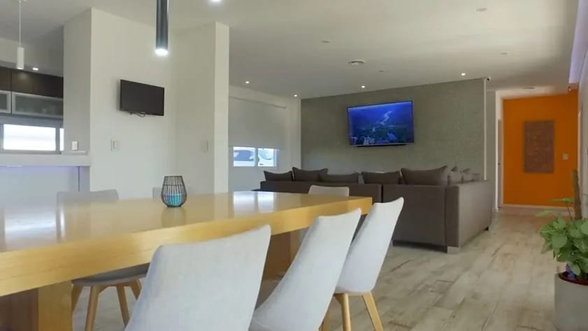 * Entrada: Puerta de madera con cerradura inteligente que da paso a un amplio living con TV de 65 pulgadas. El espacio, integrado al comedor y la cocina, invita a la unión familiar y a compartir momentos inolvidables.